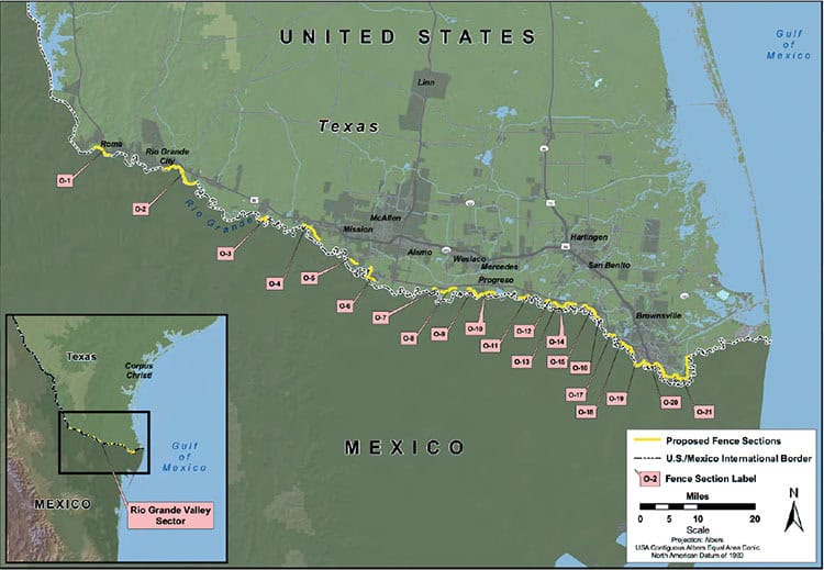The Proposed Action includes the installation of tactical infrastructure in 21 discrete fence sections (designated O-1 through O-21) along the international border with Mexico in the vicinity of Roma, Rio Grande City, McAllen, Progreso, Mercedes, Harlingen, and Brownsville, Texas. . . . The locations of the individual tactical infrastructure sections were proposed based on the situational and operational requirements of the USBP Rio Grande Valley Sector. Although some of the fence sections would be contiguous, each fence section would represent an individual project and could proceed independent of the other sections.