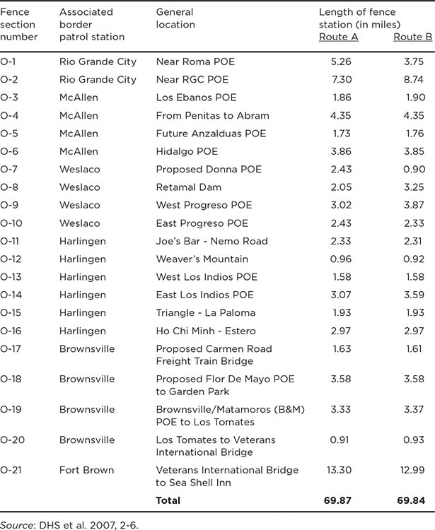 Interestingly, the Proposed Action also assumed that the 21 sections would be of different lengths, ranging from 1 to 13 miles (DHS et al. 2007, cover sheet). The fragmented nature of the RGV wall can be grasped quickly from various maps in the Draft Environmental Impact Statement where the 21 segments are marked clearly by bright yellow squiggly lines (DHS et al. 2007).